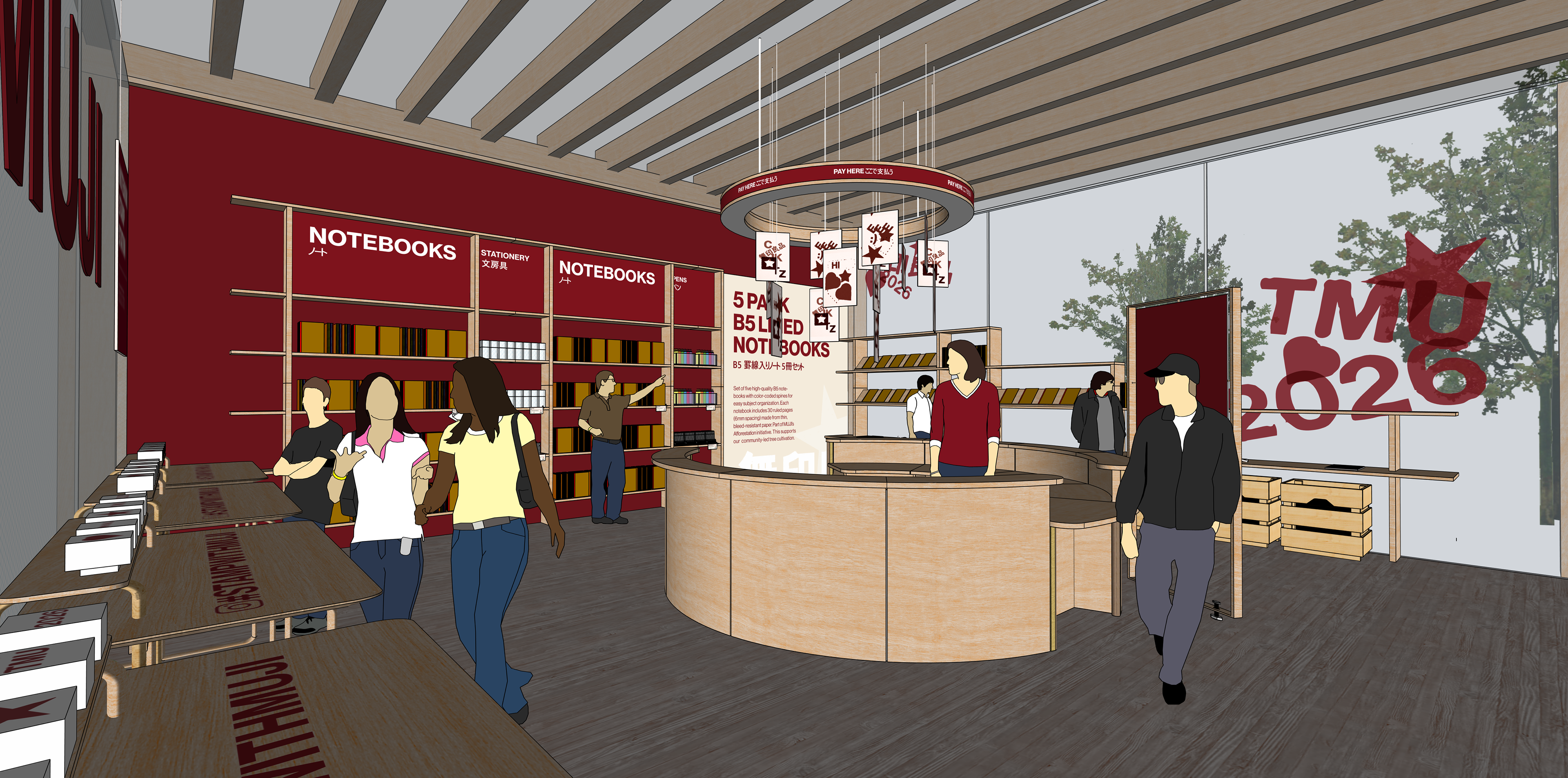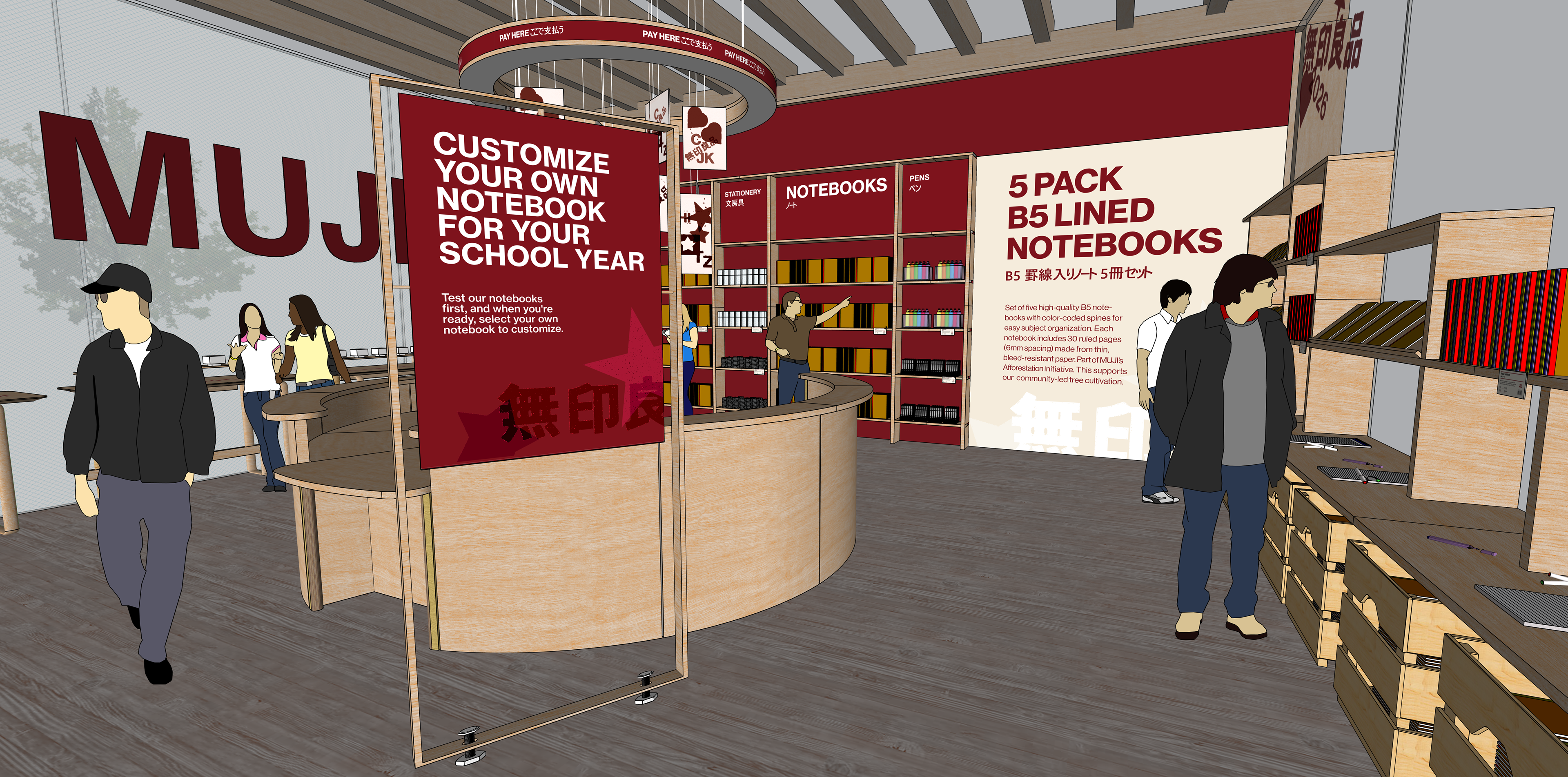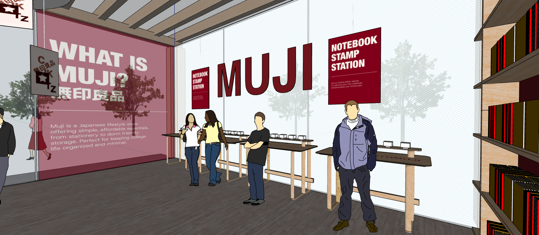The MUJI pop-up is an immersive experience designed around simplicity and calm interaction. It features a free stamping table that promotes MUJI’s notebooks, inviting visitors to customize and engage with the product in a hands-on way.